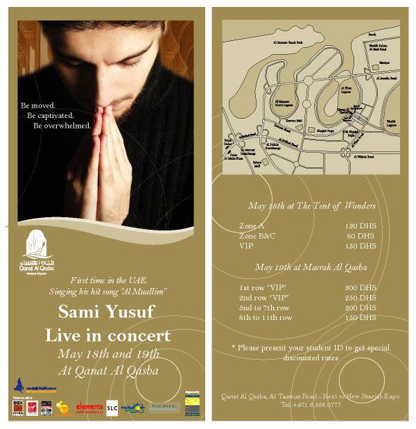Al Salamu AlikomSami Yusuf will be performing in the UAE on 18th and 19th May isA.for further details plz visit:http://www.samiyusuf.com/event/index.htm